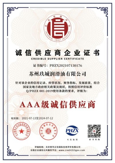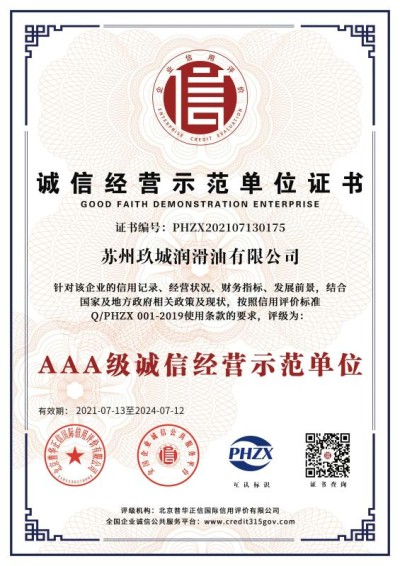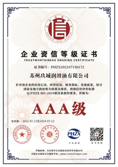 热烈祝贺JC玖城润滑油获得AAA级信用企业认证荣誉!